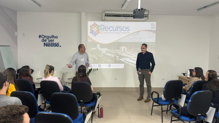 Na recepção, os acadêmicos foram recebidos por representantes da Nestlé: o gerente de Recursos Humanos, Leonnel Costa, a analista de RH, Mariana Pagan, e a coordenadora de RH, Viviane Selante. Durante a programação, os alunos tiveram contato com diferentes iniciativas e práticas que estruturam a área de gestão de pessoas da companhia.
