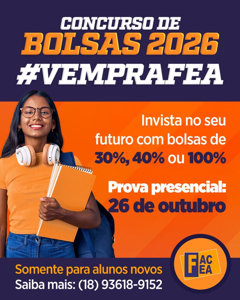 A FAC-FEA oferece anualmente o Concurso de Bolsas para alunos ingressantes, com o objetivo de reconhecer o mérito acadêmico e incentivar o acesso ao ensino superior de qualidade. Para o Vestibular 2026, serão concedidas 03 bolsas de estudo integrais e parciais para candidatos dos cursos de Administração, Ciências Econômicas, Direito, Pedagogia ou Psicologia.