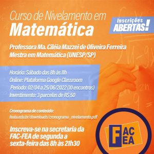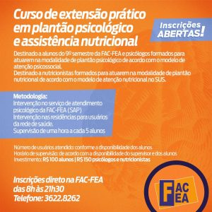 FAC-FEA abre inscrições para curso de extensão prático em plantão psicológico e assistência nutricional Leia Mais » 25/03/2022